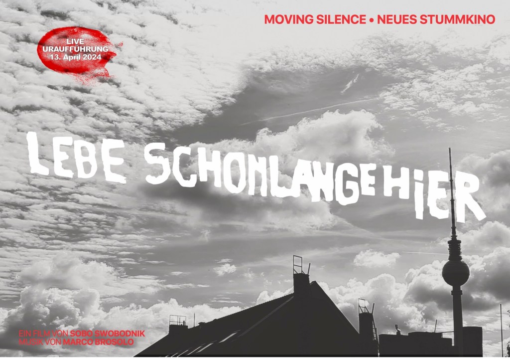 Der Stummfilm lebt! Moving Silence präsentiert »Lebe schon lange hier«. Ein Jahr lang hat der Regisseur Sobo Swobodnik aus seiner Wohnung den Alltag im Prenzlauer Berg beobachtet. Entstanden ist ein poetischer Berlin-Film, der die Schönheit im scheinbar banalen findet. Der Italo-Berliner Künstler und Musiker Marco Brosolo liefert nun die kongeniale Musik zum Film. Am 13. April wird sie im Kino Krokodil live uraufgeführt.